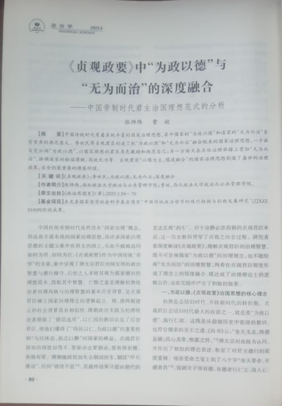 近日,我院张师伟教授与曹姣博士合作撰写的文章《<贞观政要>中“为政以德”与“无为而治”的深度融合——中国帝制时代君主治国理想范式的分析》被人大复印报刊资料《政治学》(2025年第6期)全文转载,该文章原载于《政治思想史》(2025年1期)。此次转载是张师伟第20篇被中国人民大学复印报刊资料全文转载的学术成果,彰显了张师伟在政治学理论、中国政治思想史及中共党史等研究领域的深厚造诣与持续探索。