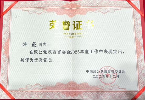 近日,中国致公党陕西省委员会发布《关于表彰2025年度先进集体及个人的决定》,我院致公党党员洪薇同志获评“优秀党员”荣誉称号。