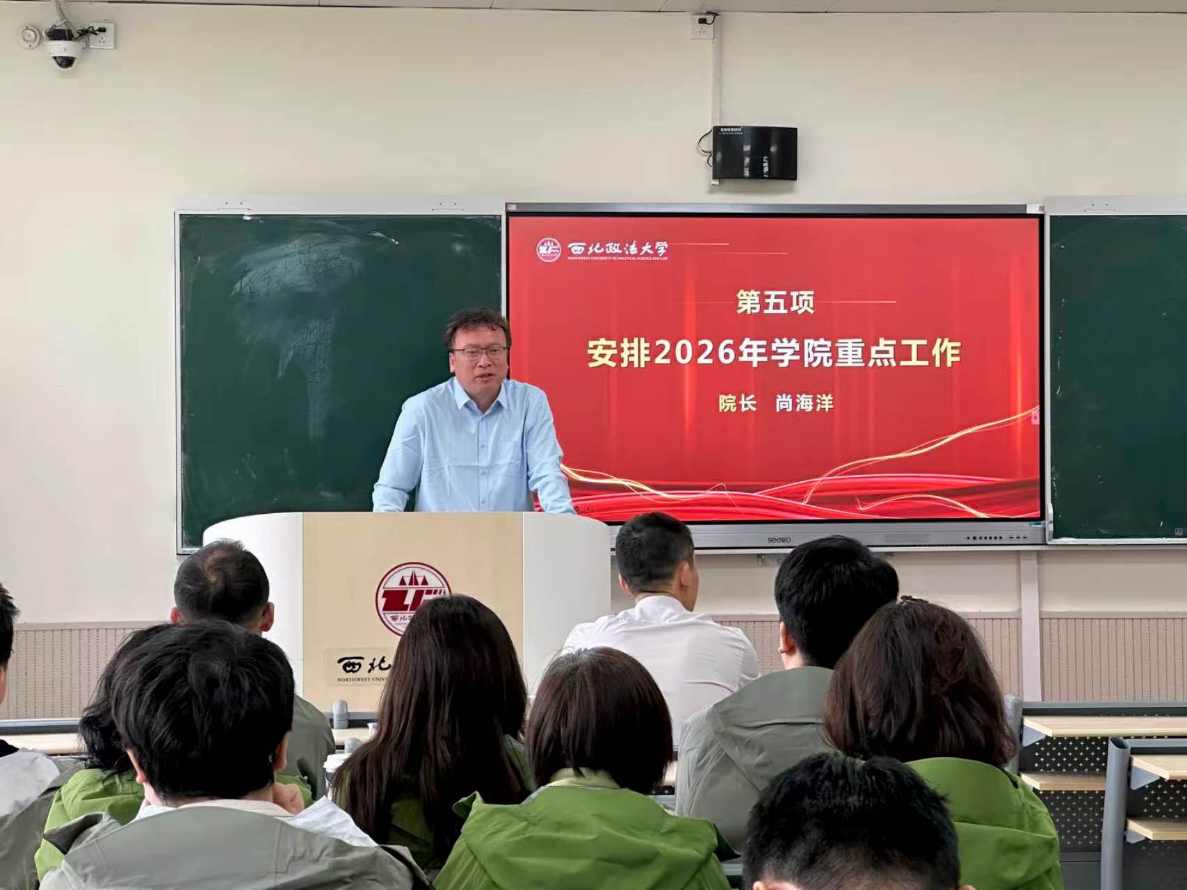 尚海洋围绕学院发展全局,对2026年重点工作做出全面部署。他强调,一是强化教学管理、深化课程建设;二是抓实科研攻关与课题申报,优化学科布局与人才培养;三是规范考核评优工作,全面激发学院发展活力;四是积极有序推进团队建设工作,做好新一轮学科评估、岗位聘用的准备工作;五是加强团队队伍建设,持续加大人才引进力度,提高人才培养质量。